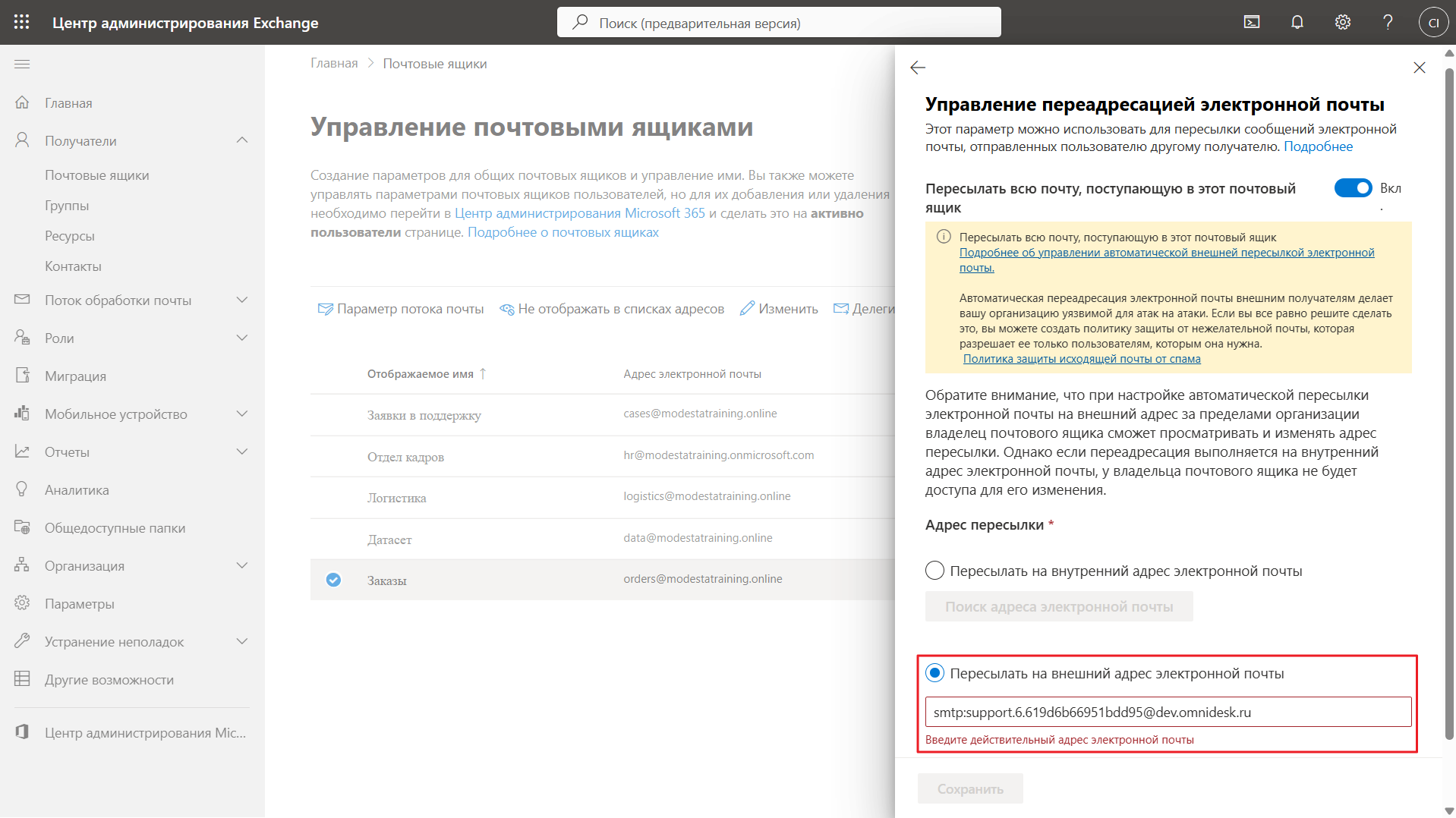 Без этих изменений почтовый сервер Exchange Online блокирует автоматическую пересылку писем на внешние адреса.