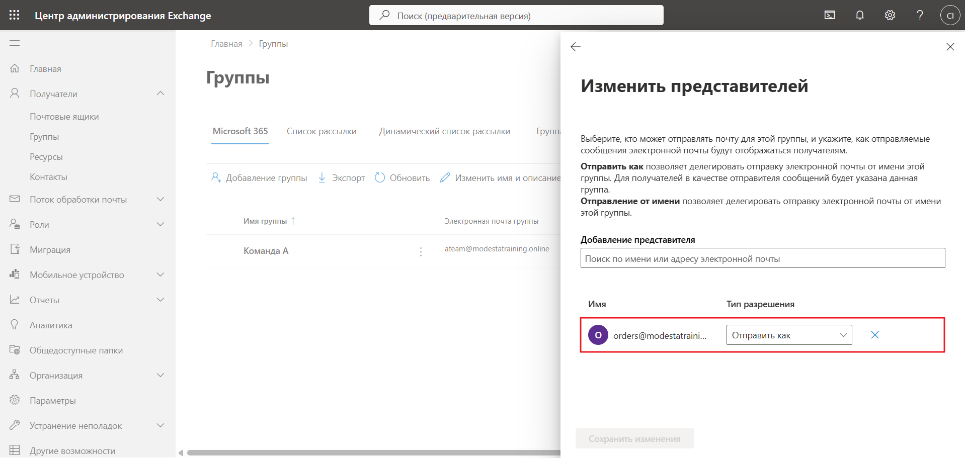 б) В подразделе Управление представителями кликните по Изменить управление представителями и укажите опцию «Отправить как» для почтового ящика Exchange Online, при помощи которого планируете подключать саму группу: