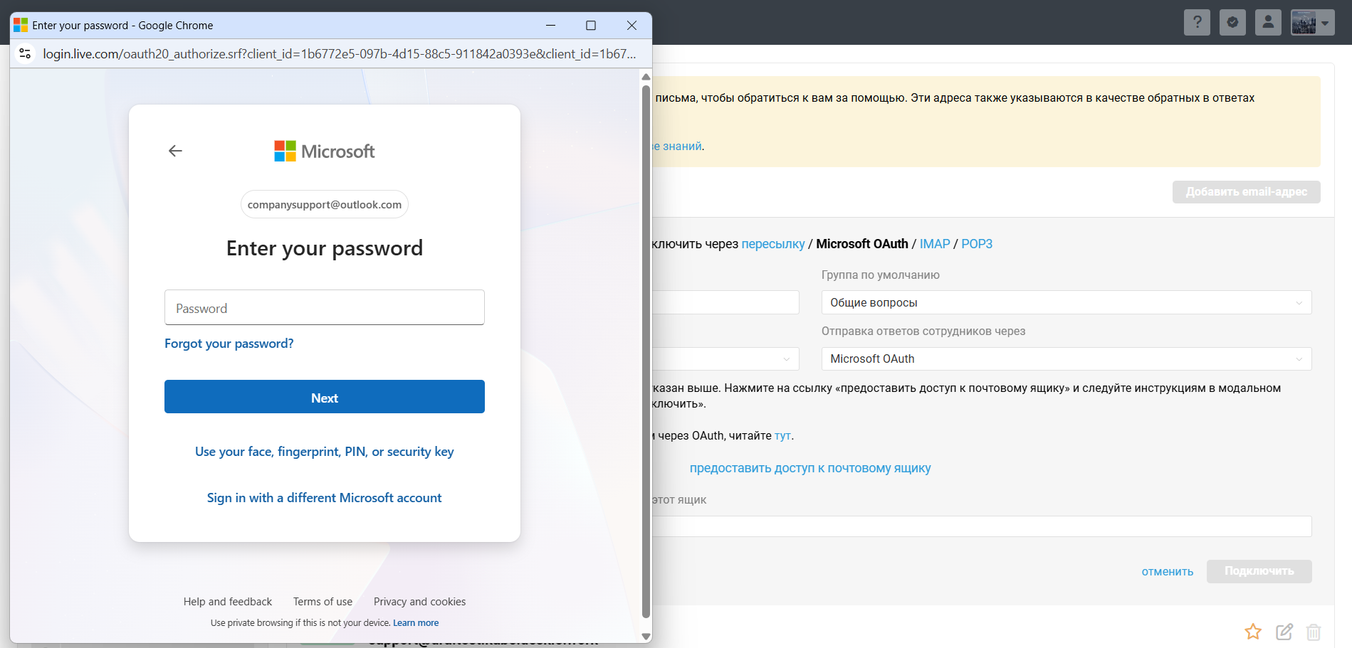 После того как администратор вашего почтового сервера выдаст все разрешения на доступ к ящику через стороннее приложение, для подключения канала понадобится авторизоваться в форме Microsoft и — в случае активной двухэтапной аутентификации — подтвердить личность указанным в настройках способом.