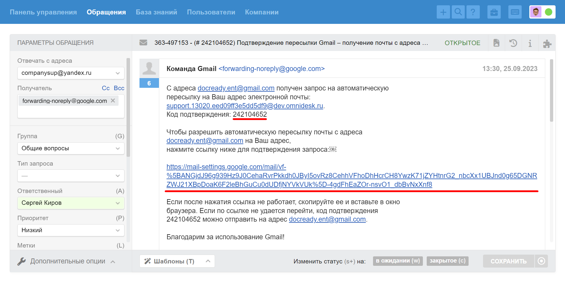 в. Перейдите в аккаунт сотрудника в Омнидеске, найдите письмо от [email protected] и подтвердите пересылку, пройдя по ссылке.