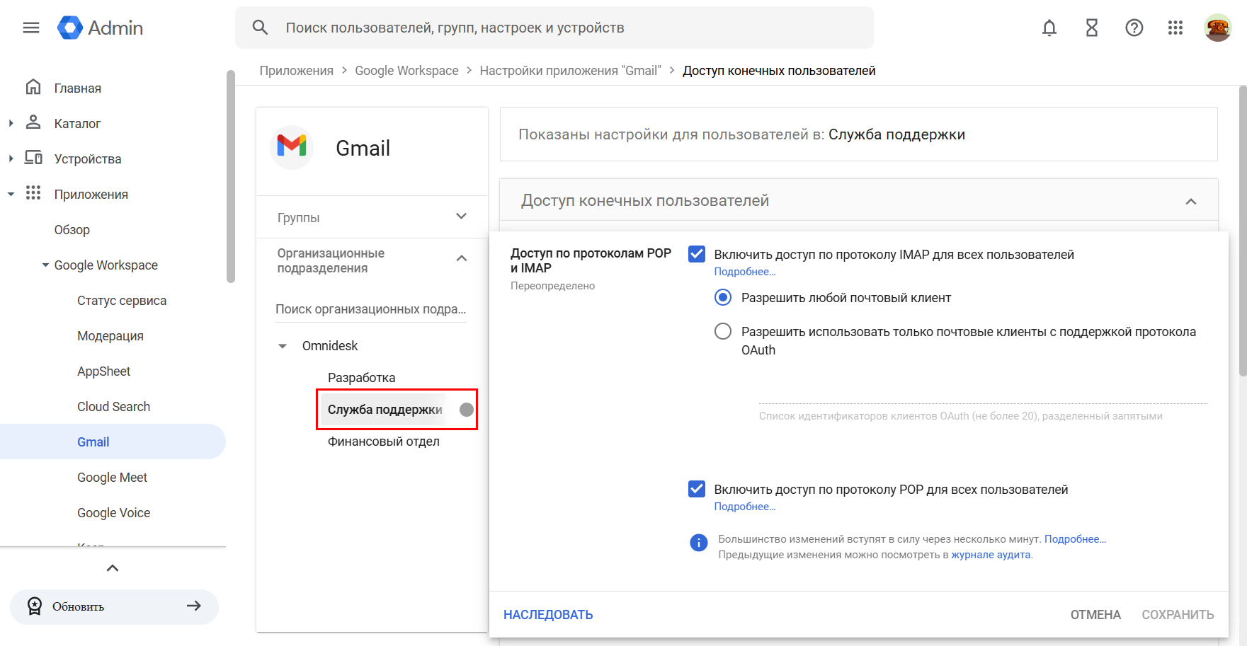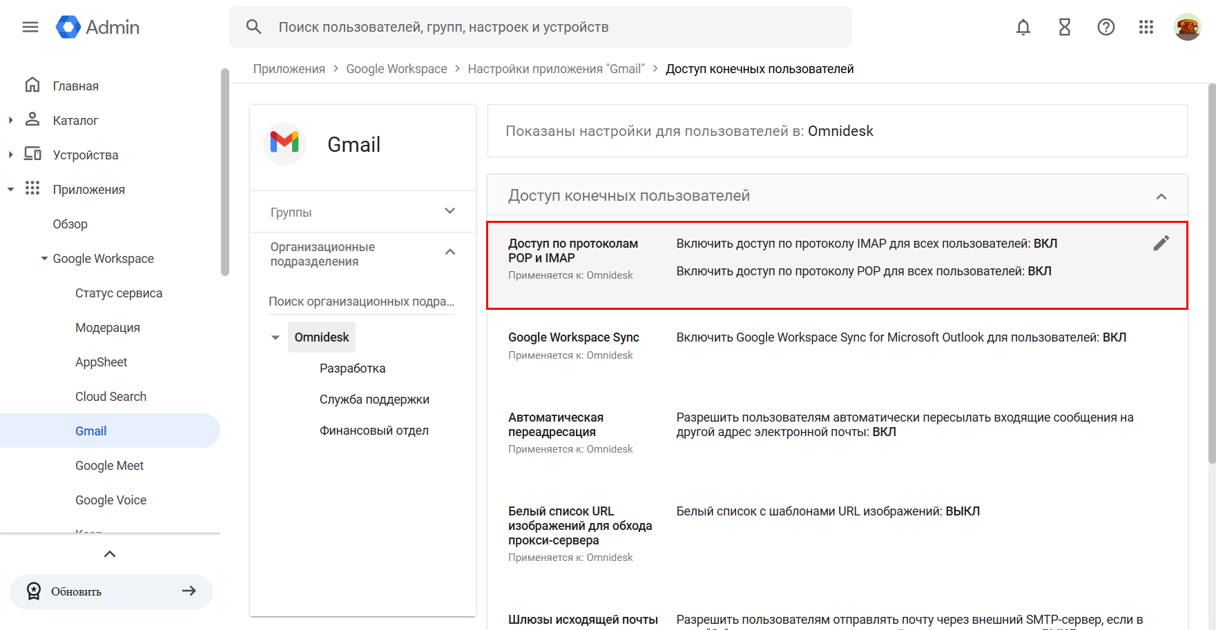 По умолчанию в Google Workspace протокол IMAP включён на уровне всей организации, и эта настройка наследуется всеми подразделениями. Администратор может изменить параметры для конкретного подразделения — отключить или, наоборот, включить доступ.