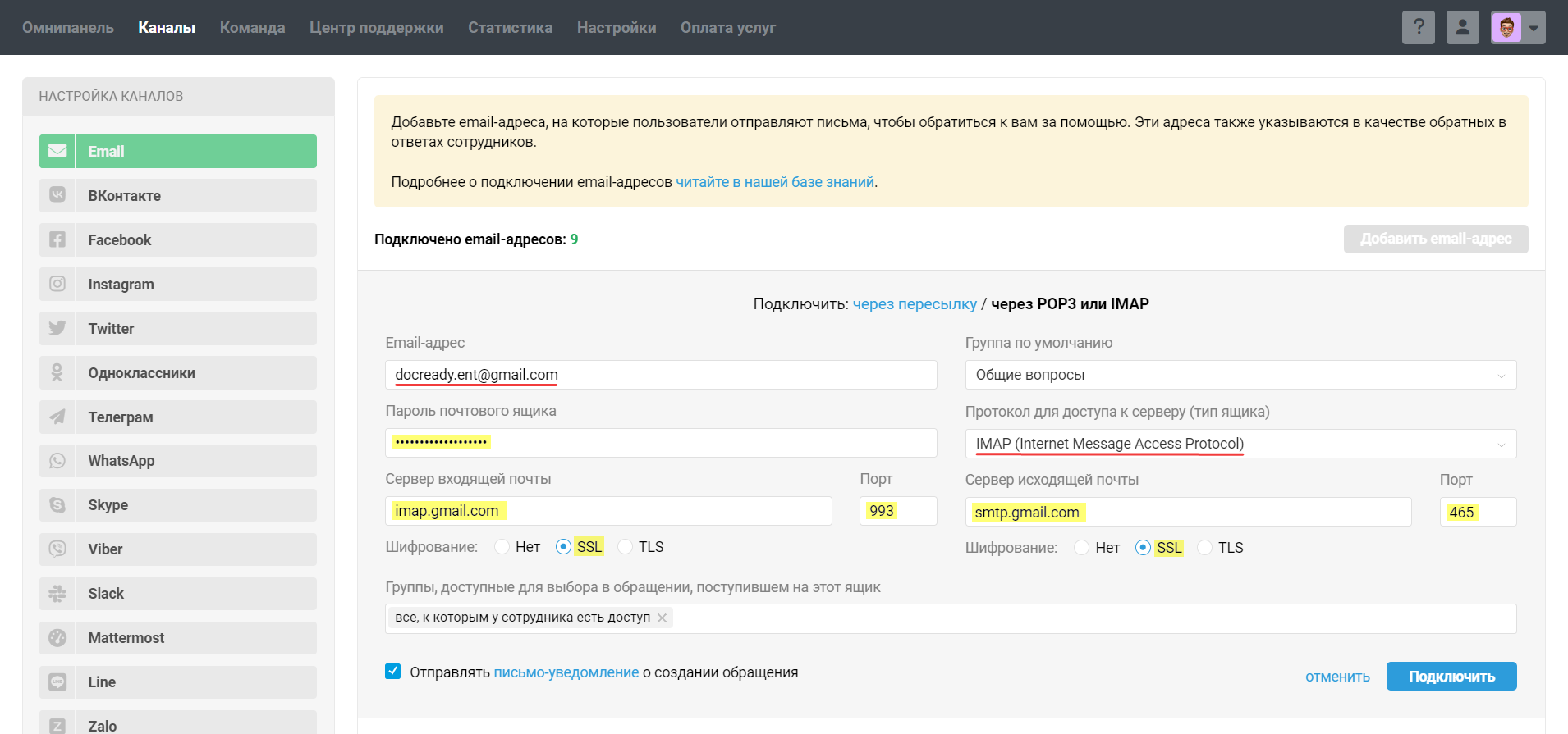 Шаг 2: настройте подключение ящика в Омнидеске.