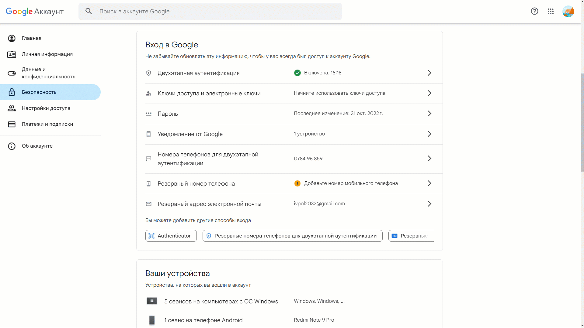 2. Перейдите в раздел «Безопасность» и включите двухэтапную аутентификацию (нужно выбрать дополнительный канал для получения одноразовых паролей: SMS, звонок, приложение от Google и т. п.).