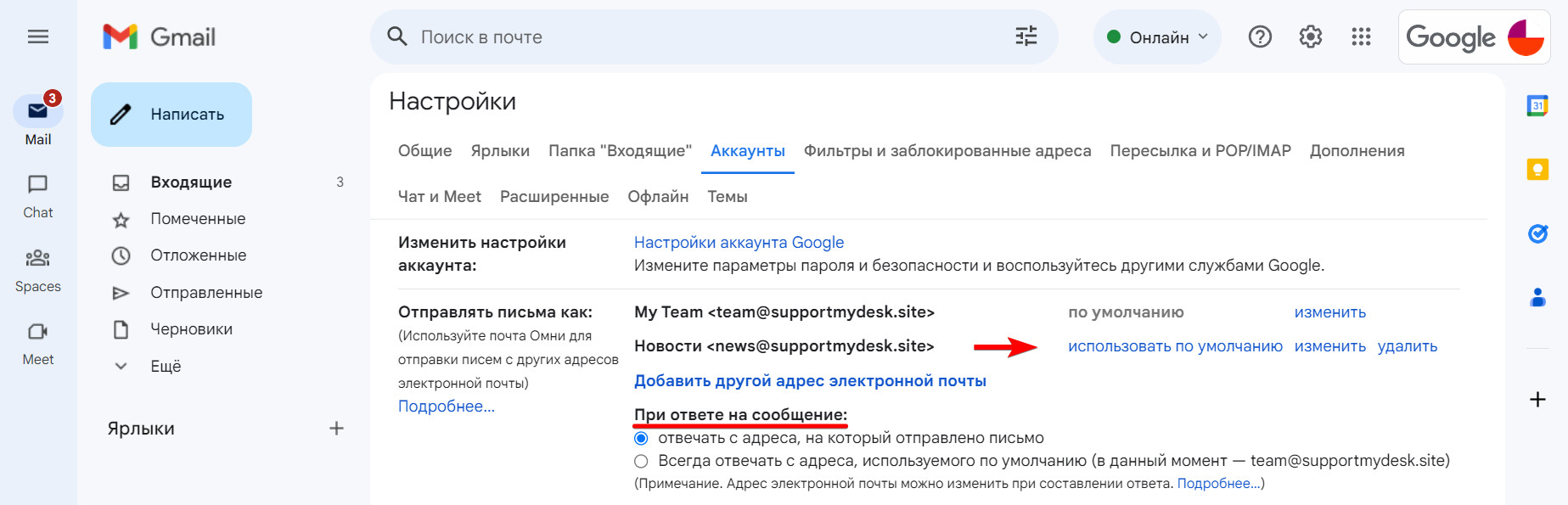 г. После подтверждения в настройках Gmail выберите, от имени какого электронного адреса будут отправляться ответы: