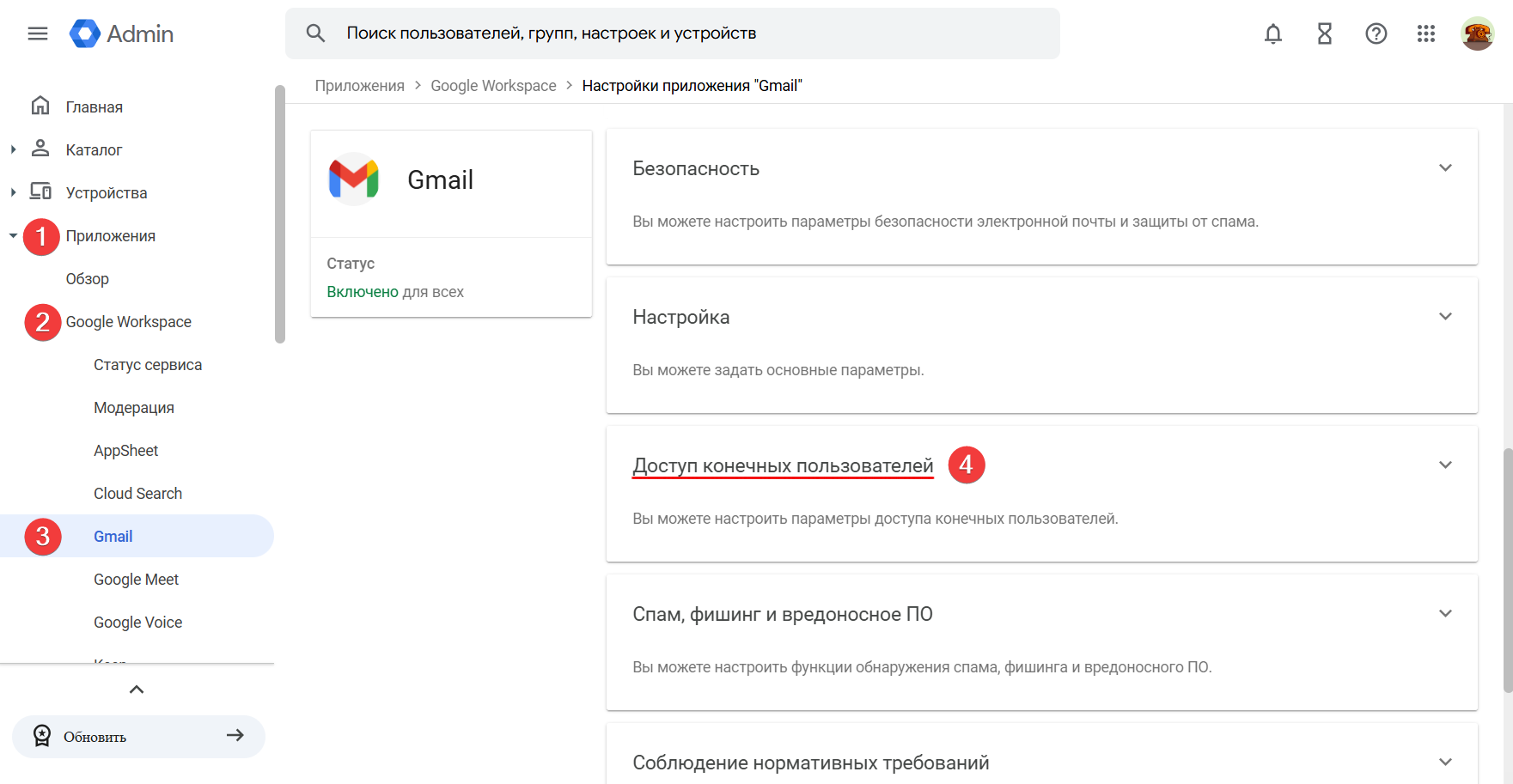 Если вы используете Google Workspace, то убедитесь, что пользователям разрешен доступ по протоколу IMAP. Проверить это можно в консоли администратора по пути Приложения →Google Workspace → Gmail → Доступ конечных пользователей.