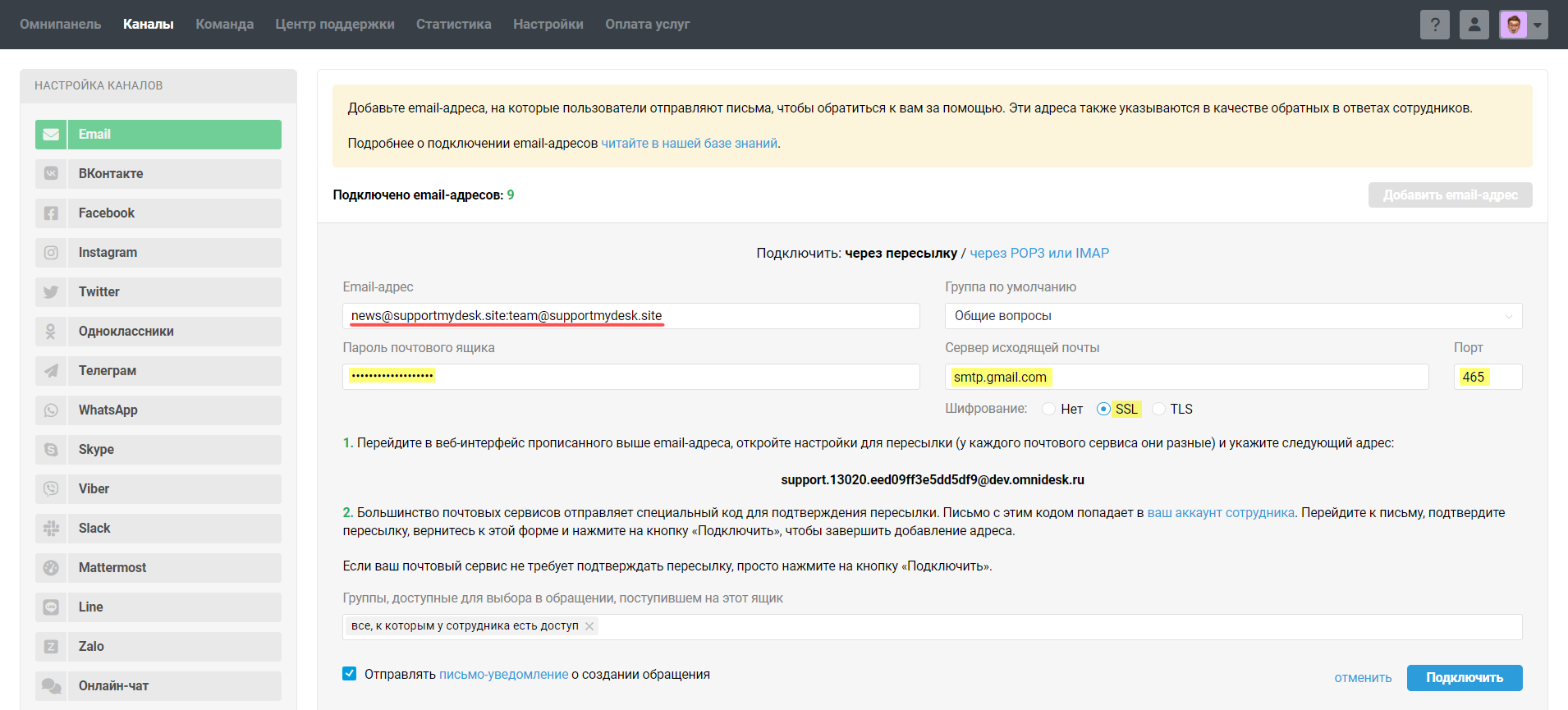 а. Перейдите в аккаунт администратора в Омнидеске → Каналы → подраздел Email, нажмите «добавить email-адрес» → в опции «Подключить» выберите «через пересылку». Скопируйте указанный системный адрес для пересылки.
