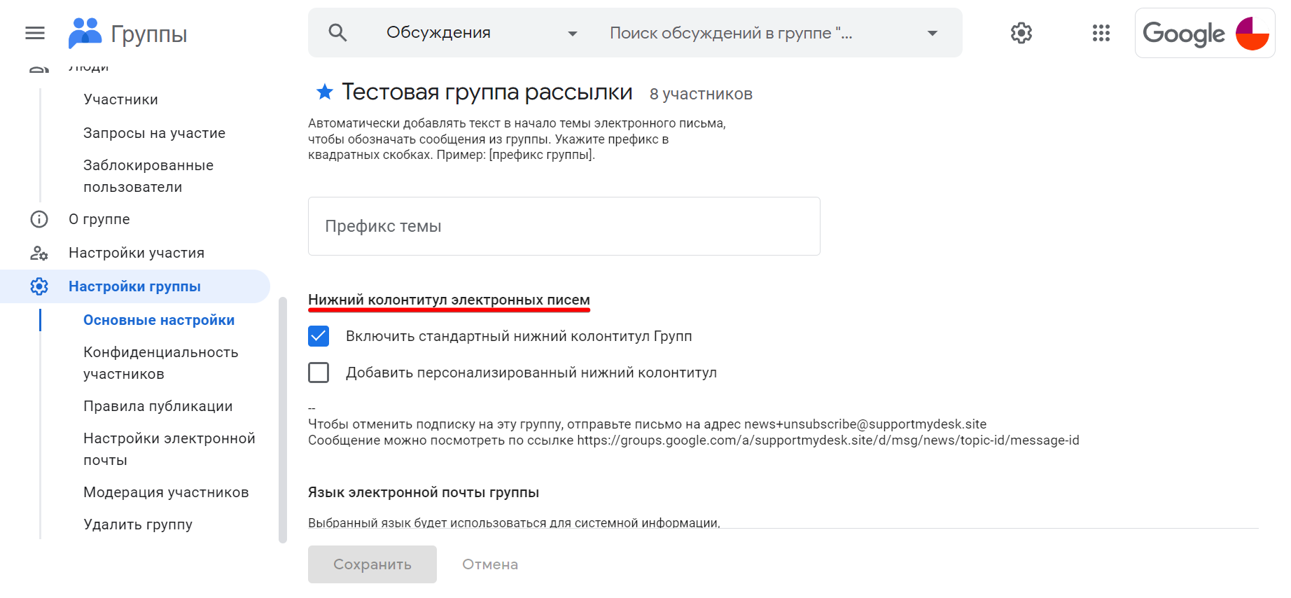 Чтобы отключить его, перейдите в меню приложений Google → Группы → названию группы → раздел «Настройки группы» → подраздел «Основные настройки» и в блоке «Нижний колонтитул электронных писем» выберите нужные вам настройки:
